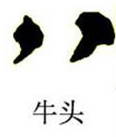 2、牛头:像牛头状。主要是笔头墨水过多,造成涨墨过甚。或是笔锋转驻过重,下按之力太大,而出锋太快,提锋大疾所致。故在书写时,笔头濡墨不宜过多,下按之力根据字的大小适可而止。