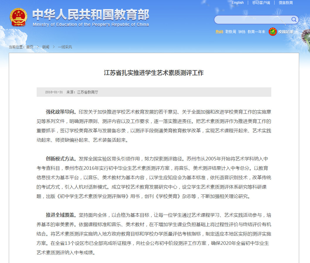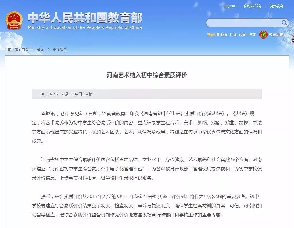 艺术素质测评结果计入中考成绩