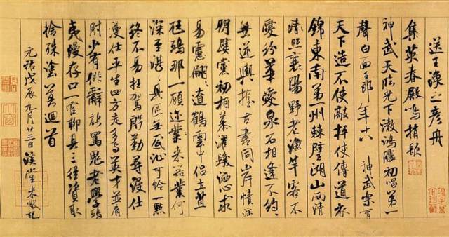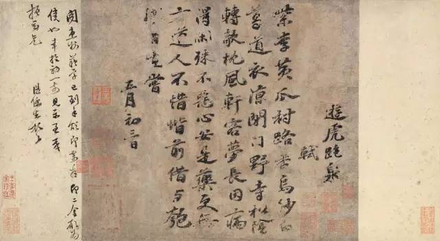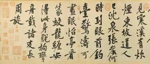 4、黄庭坚行书笔势纵横,点画开张,虽是辐射式结构,但并不疏松;体势欹斜,但并不倾倒。《松风阁诗卷》是其晚年代表作,以上特点都有充分体现。临写时需注意体察黄所追求的“笔中有物”的内涵之美,或曰“气韵”相胜。