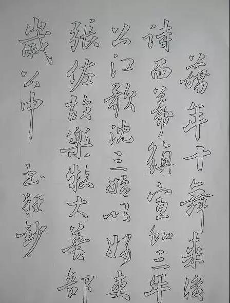 将字帖复印放大,用自动铅笔,很细的“双钩”。大家一看肯定会说,以为什么方法呀,原来如此,呵呵,那您做过吗,做过多少呢?大道至简。古人为什么写字精,因为老实啊,没字帖,就借人家的帖子,双钩填墨做个帖子。这个过程练就他非凡的观察力。不要以为你能看清楚、能看懂字帖,你钩了后,会知道你没看出来的东西太多了。