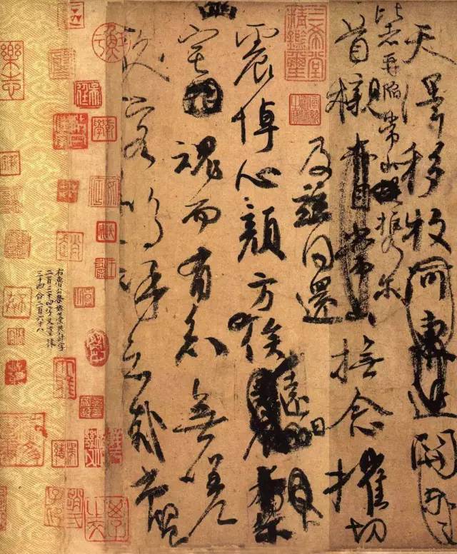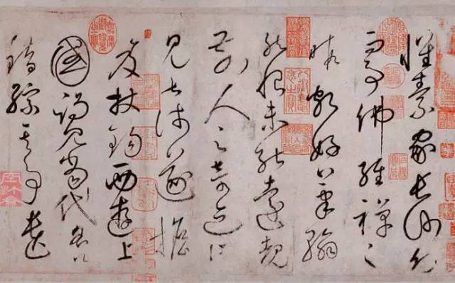 狂草字的写法和今草是一样的,不同的是写得狂放,连带、省略更多,最能体现书者狂放的性情。史称“颠张醉素”,是讲张旭、怀素常在醉酒后,笔飞墨舞,其狂草线条流走飞动,结体险绝,谋篇奇特,尤如夏云变幻莫测,痛快淋漓。