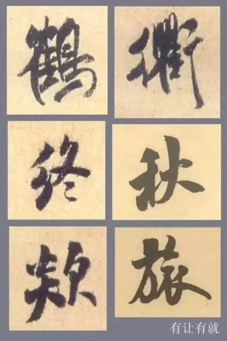 字内部之间有让有就,笔画才能穿插呼应,团结一体。需要指出的是行书的让就较楷书的程度大。楷书的就还保持字内笔画的不重叠,行书的就有时会几笔相接,有重叠的部分。如“鹤”、“衢”、“终”、“秋”、“旅”等字。