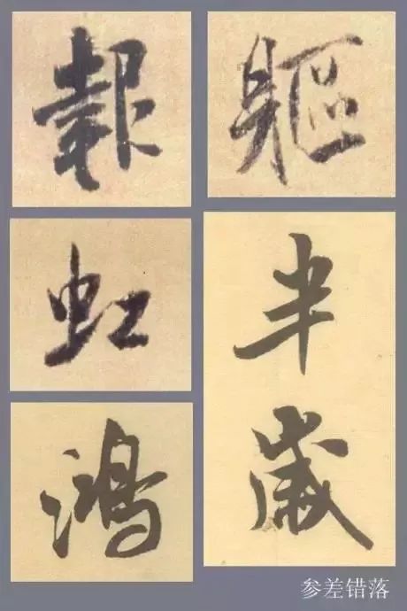 类楷书结字的规律,为了忌讳字的平齐,字的各部分适度错开位置,反而重心安稳,生动有趣,从中也体验到书法家创造性的表现。如:“报”、“躯”、“虹”、“鸿”是上下错位,“半岁”是左右错位。