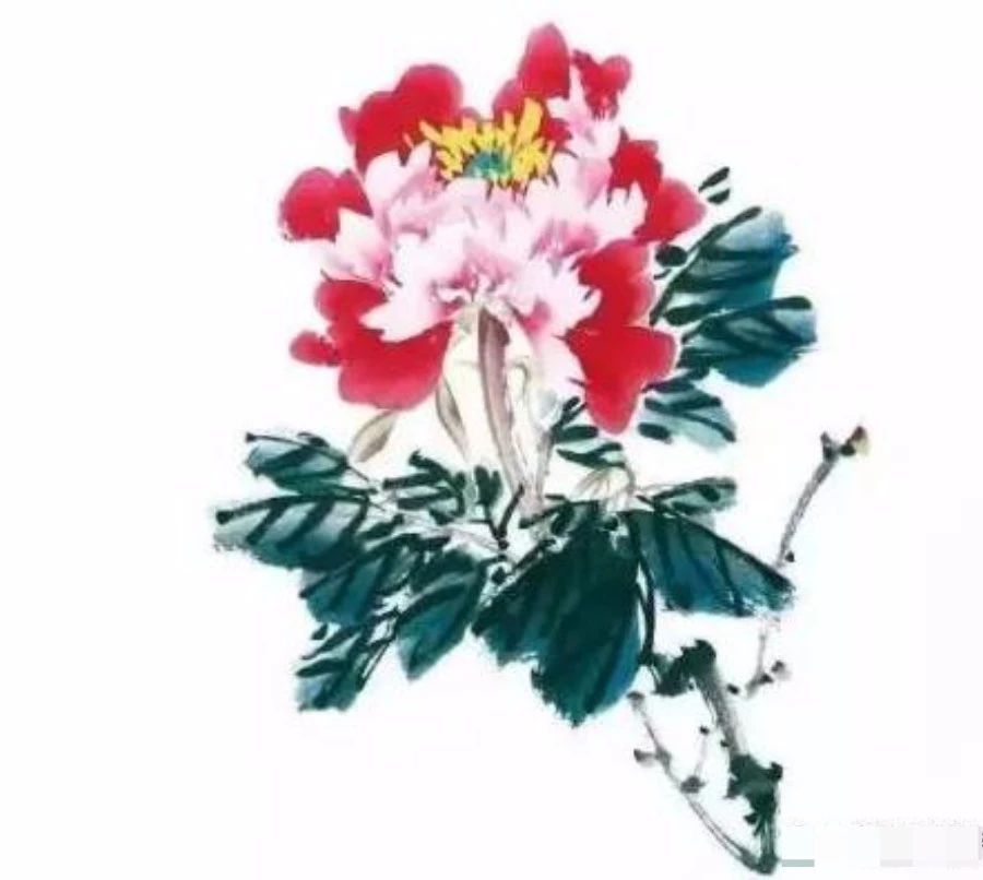 浓曙红提染根部以后,再用胭脂提染最深处,中等浓度的曙红刻画一下瓣尖的细微结构变化。染足明暗关系后用稍浓的白色从瓣尖往根部倒染。、不要每一片花瓣都染到,而主要提染花瓣的最亮面和离我们最近的几片花瓣,粉不可过厚,过厚易匠气。染色结束后,淡曙红水复勒开始的淡墨线,复勒的时候保持线条的流畅度。吸满浓粉黄的笔尖略蘸点朱磦立粉点花蕊,白色勾花丝。最后,调和花青和藤黄,为牡丹添加叶子。