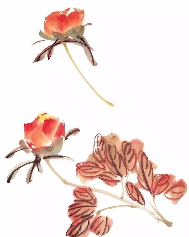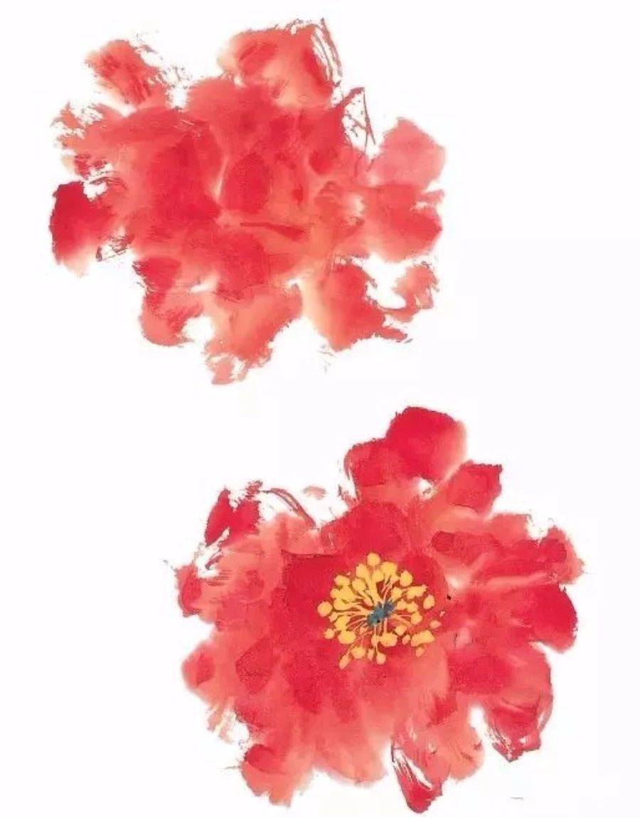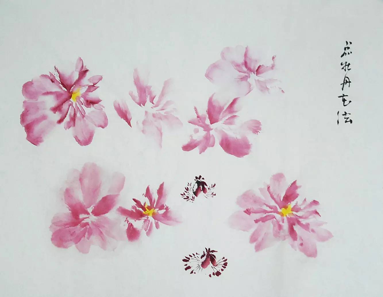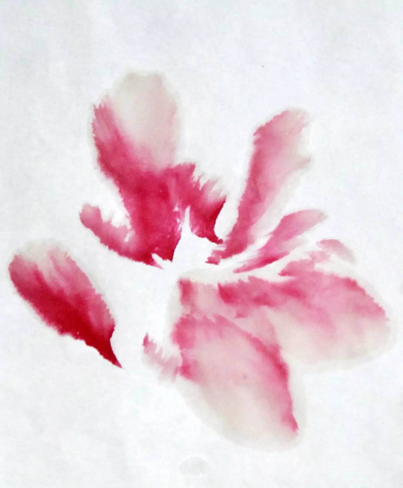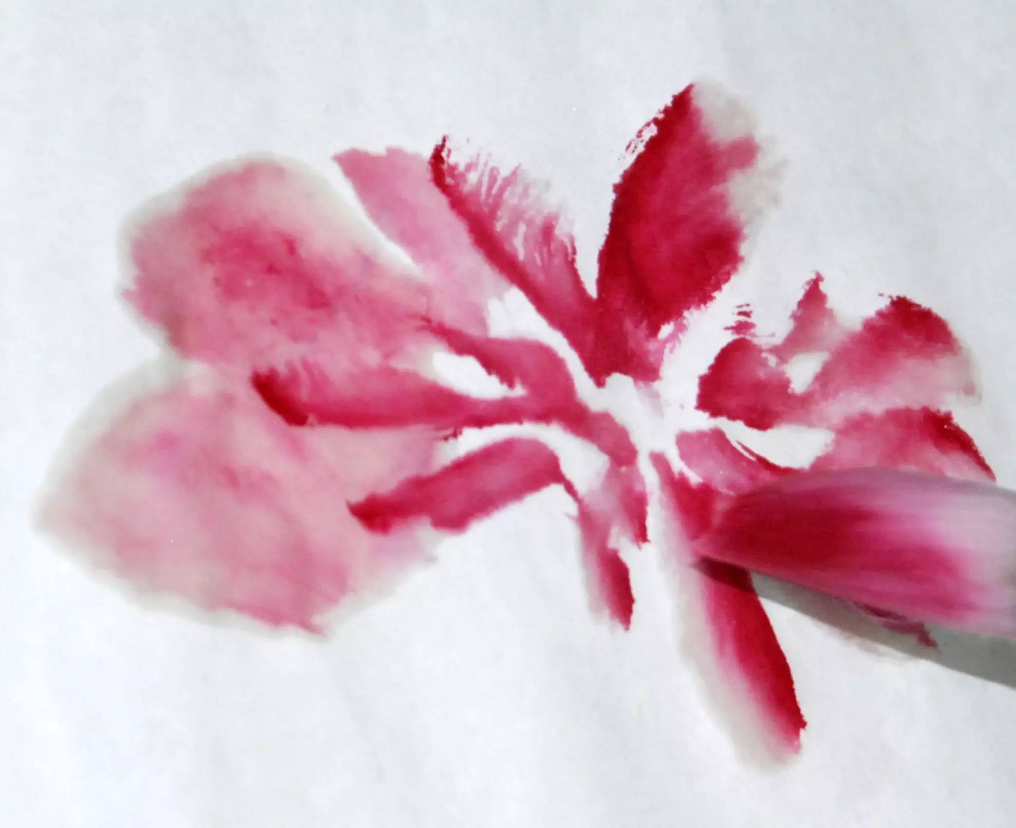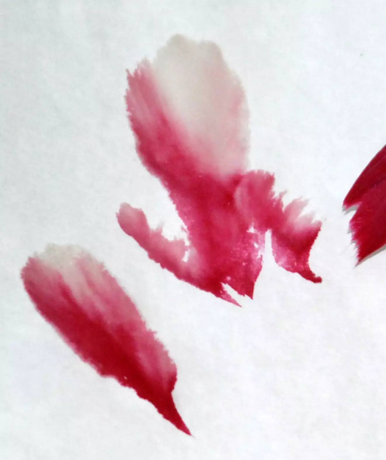 1.花瓣的画法:朱磦调胭脂加适量水,由中间开始画起,用笔时注意方圆结合和浓淡虚实。有的花瓣可用飞白之笔画出其圆中有缺的形态,水迹的运用也不可或缺。