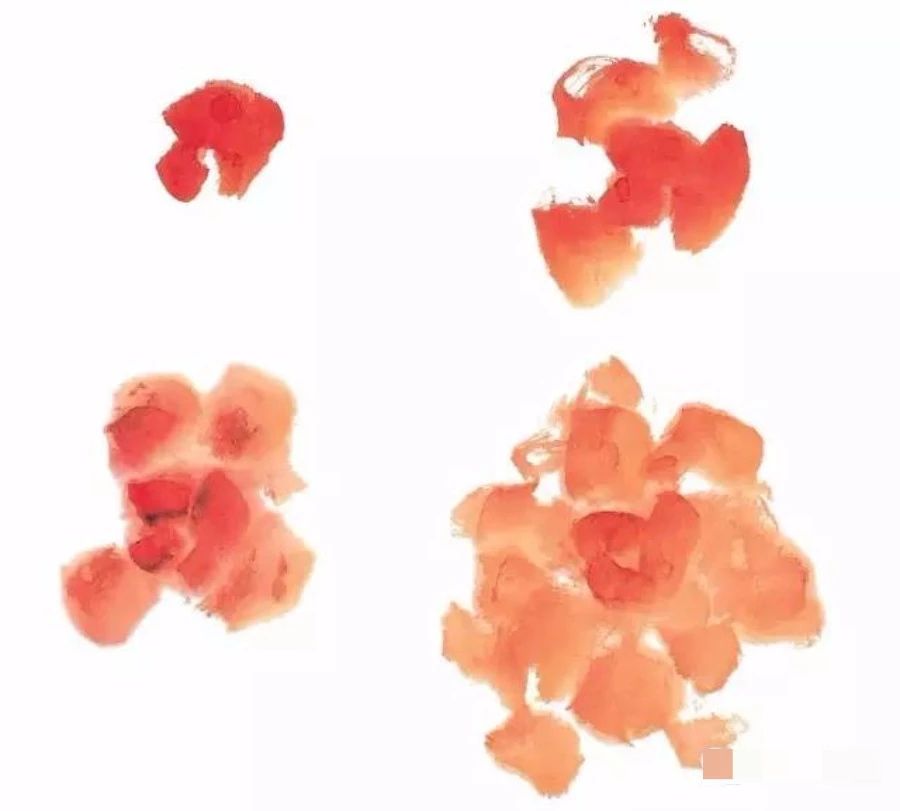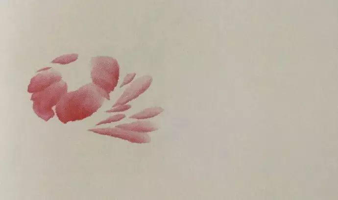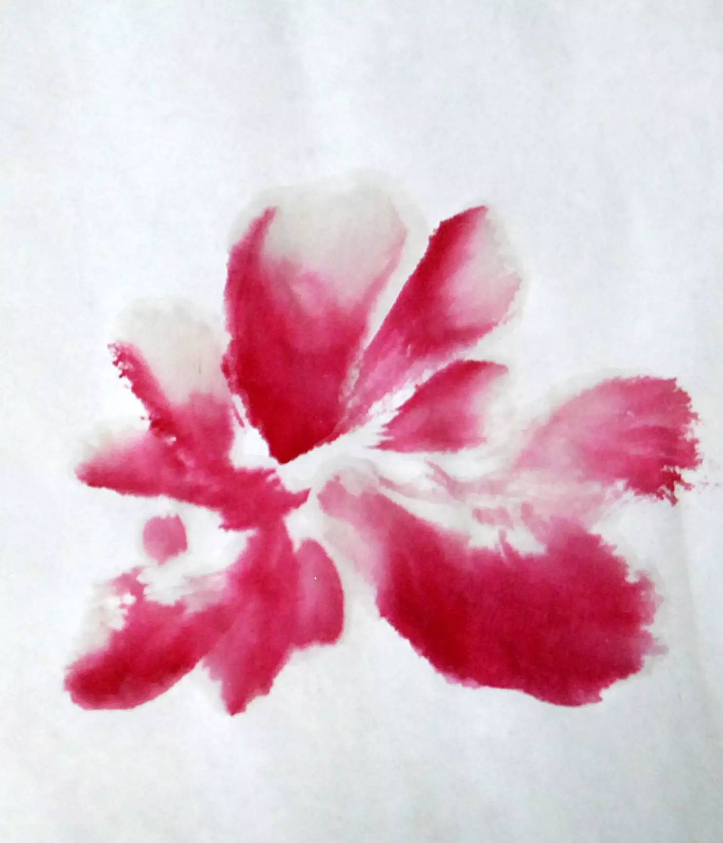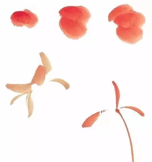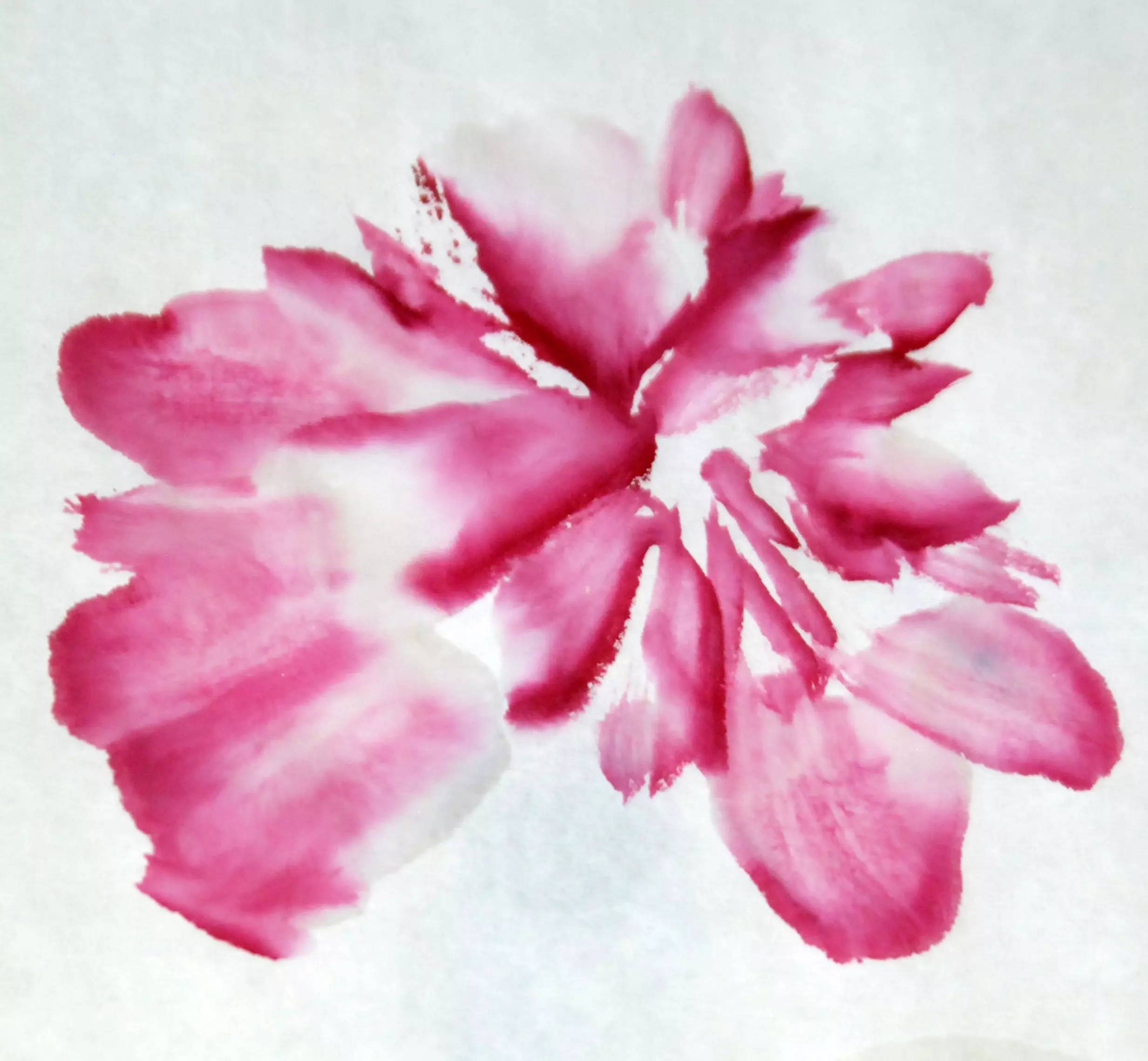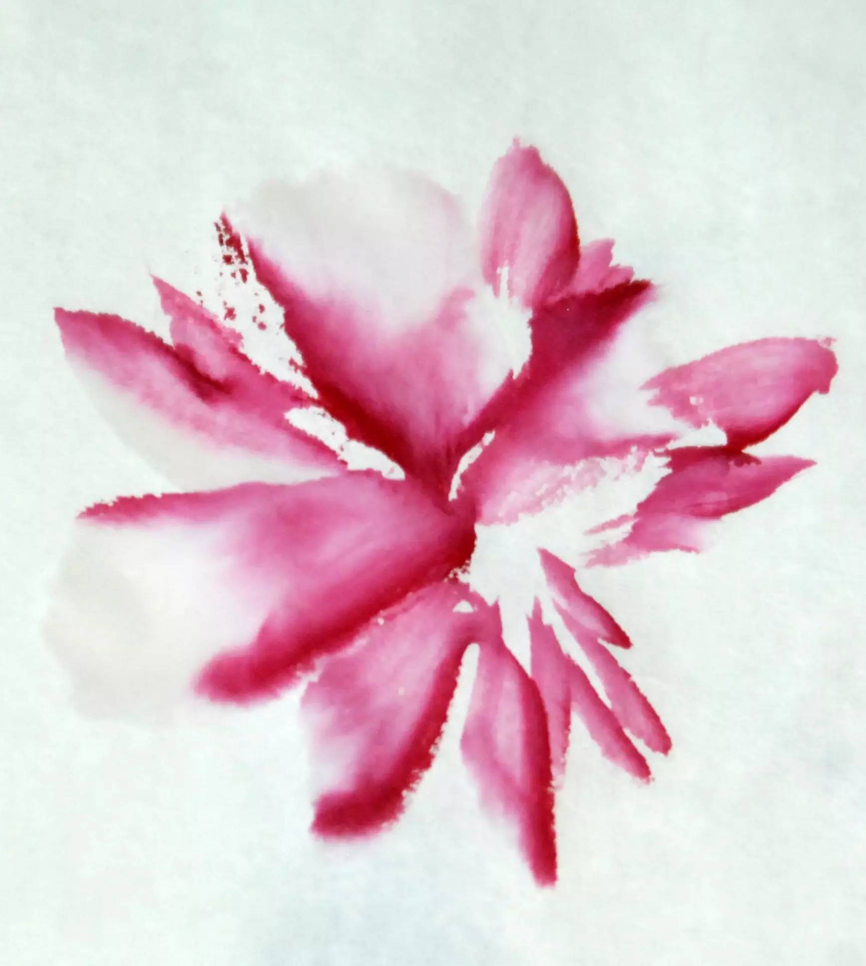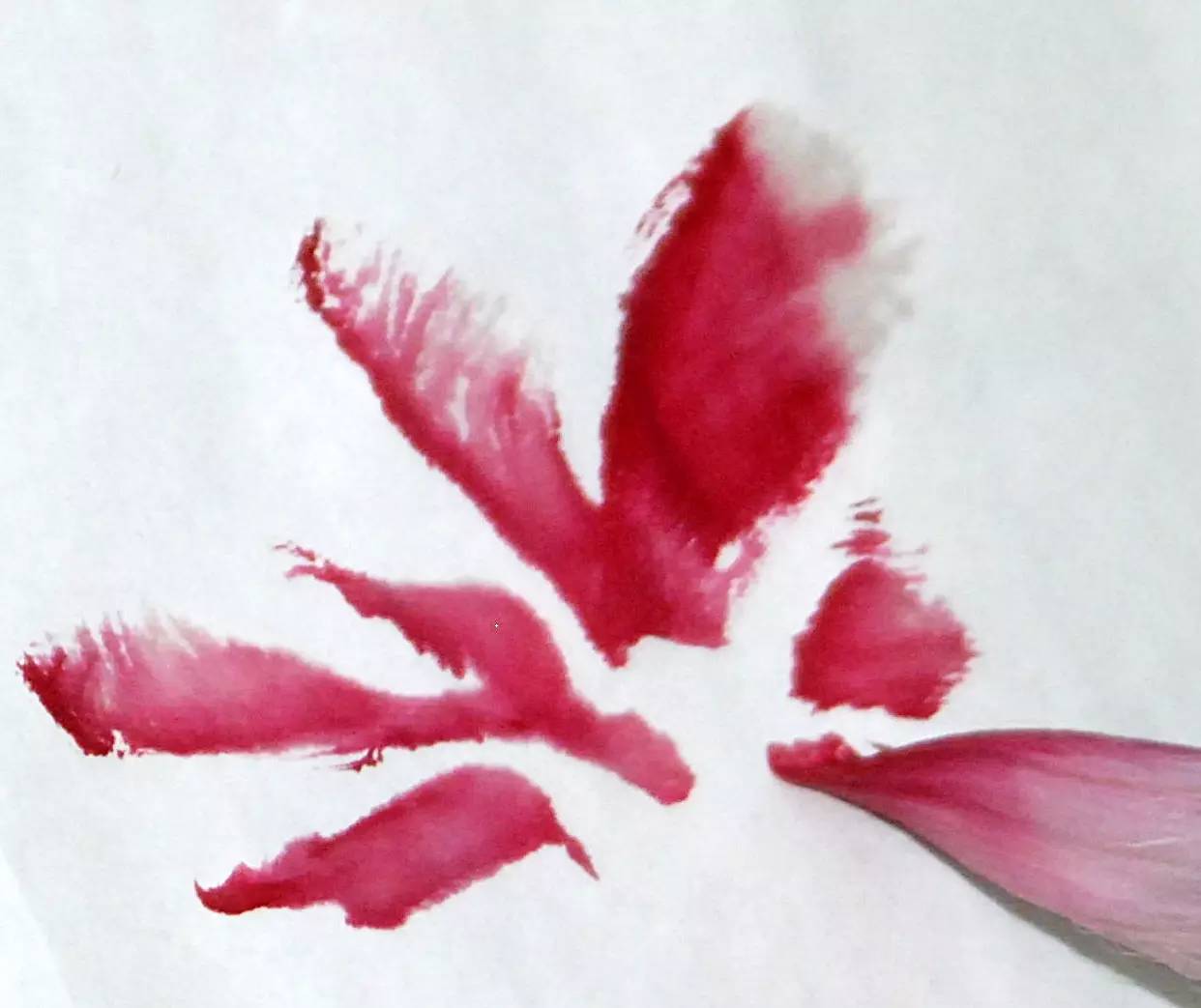 1.花瓣的画法:朱磦调胭脂加适量水,由中间开始画起,用笔时注意方圆结合和浓淡虚实。有的花瓣可用飞白之笔画出其圆中有缺的形态,水迹的运用也不可或缺。