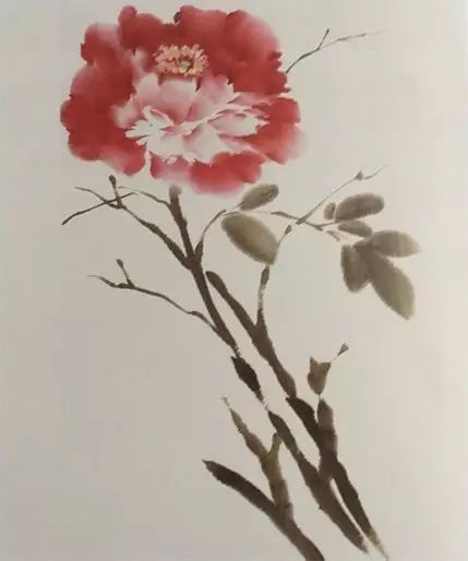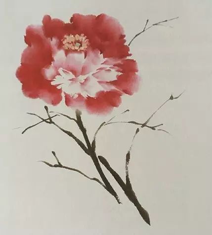 牡丹枝干主要出枝的分布和穿插要合理,要有主次之分。出枝按不等边三角形形成分布,分主枝、次枝及破枝。主枝用笔需老辣、提按、顿挫、嫩枝需加嫩绿及朱磦胭脂色、用笔自然挺拔即可。