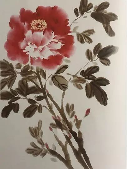 牡丹花蕾从形成到开裂,一般从一两瓣到数瓣的形态变化较多。花瓣从外向内包裹,三笔或五笔铺色而成,再在花蕾底部画出叶芽,叶枝。花蕾用笔要简洁大方,落笔准确,花瓣要整碎结合。叶芽要用朱磦蘸胭脂,或再蘸点墨画,半干时用浓胭脂略勾叶茎。
