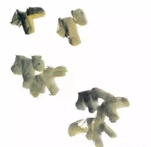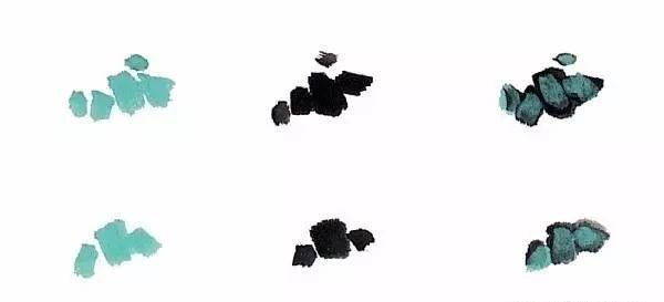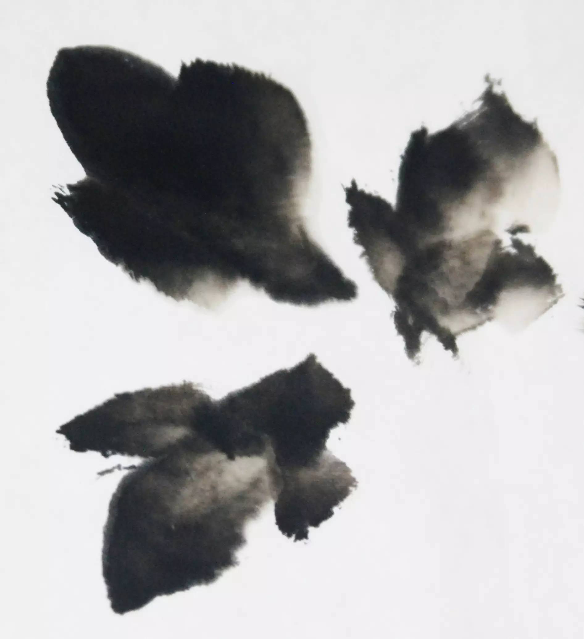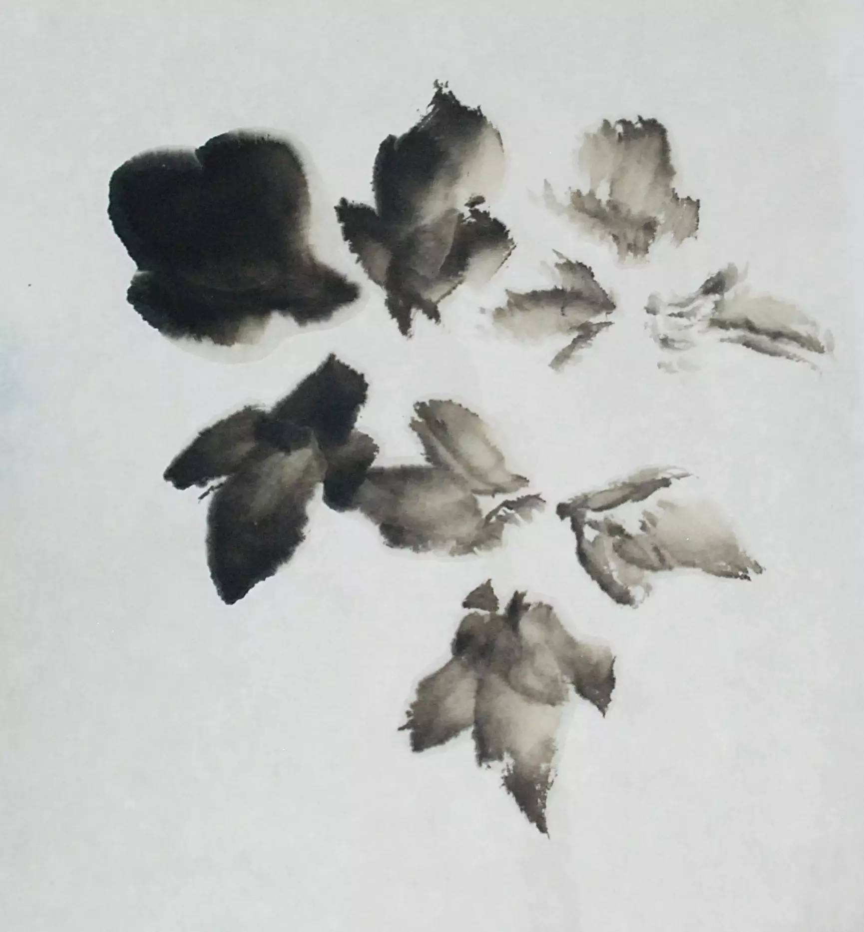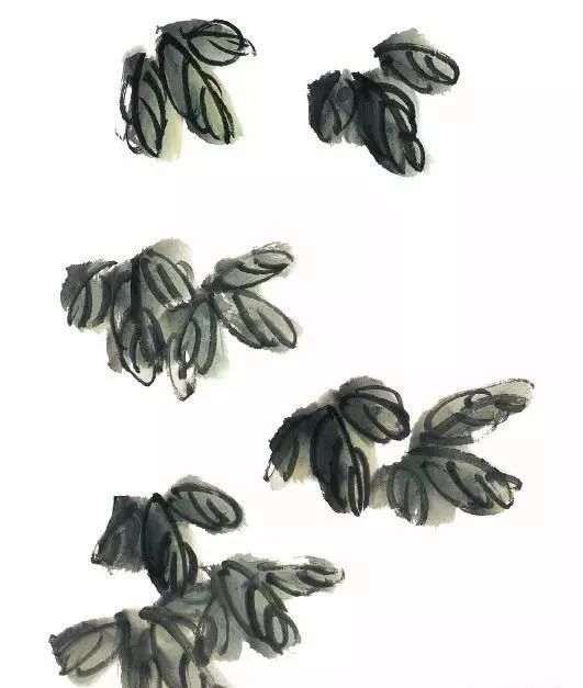笔肚淡墨,笔尖蘸浓墨侧锋画叶,三叶一组,画时要注意前后的虚实关系。