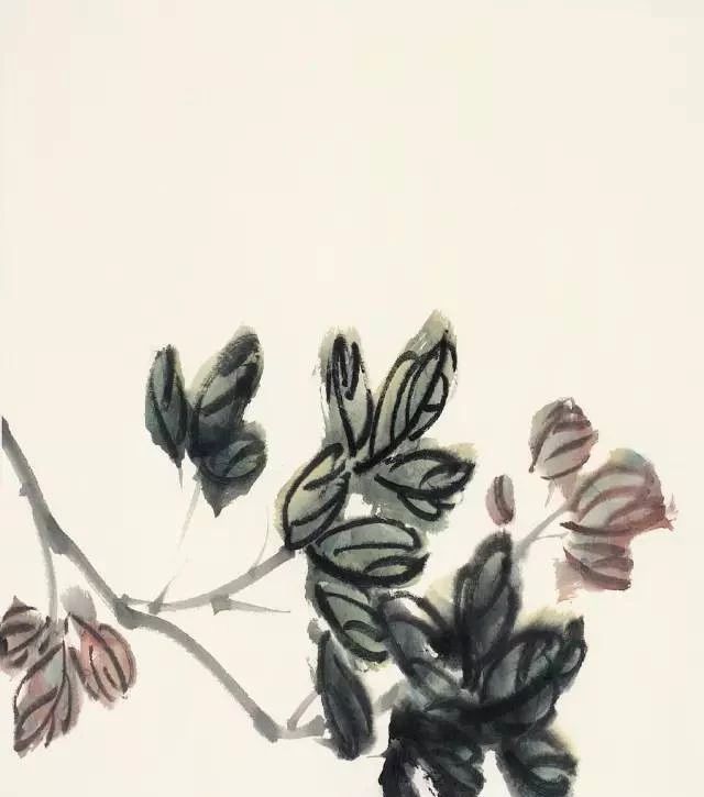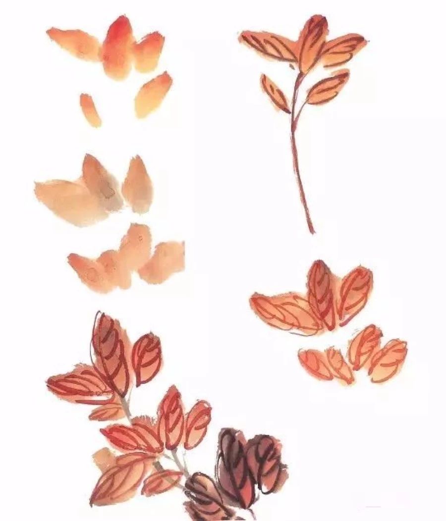 叶子的画法:先用颜色摆出叶子的组合,稍嫩的叶片用调胭脂加水即可,较老的叶片在此基础上蘸少许墨色就好。叶片颜色将干未干时中锋用笔勾叶茎。