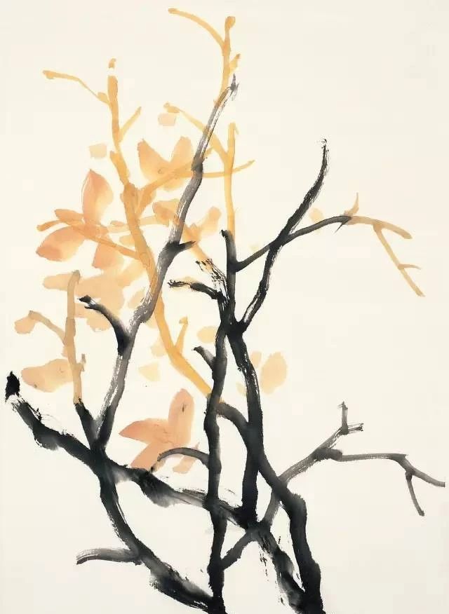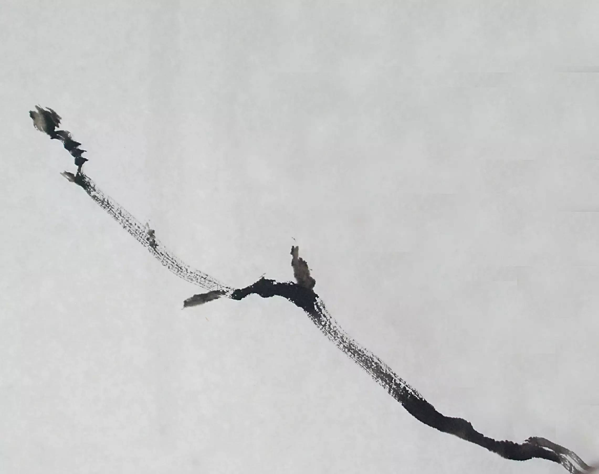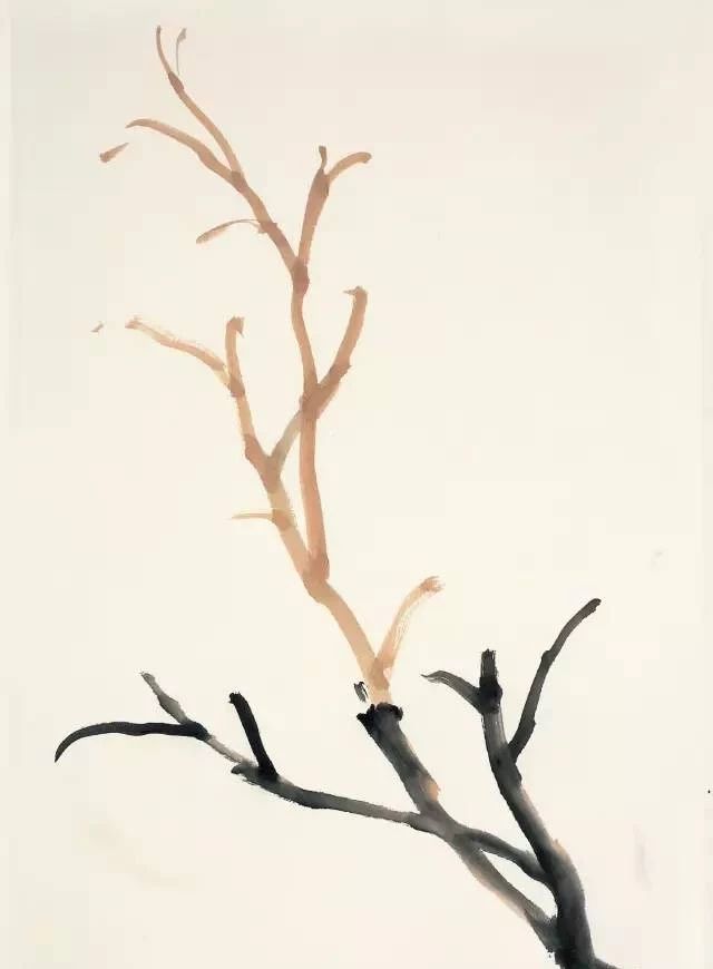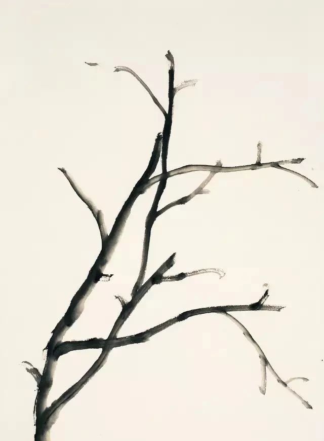 笔尖蘸墨,加少许水分,逆锋出枝。运笔注意提按和顿挫。枝条间的穿插要疏密得当。