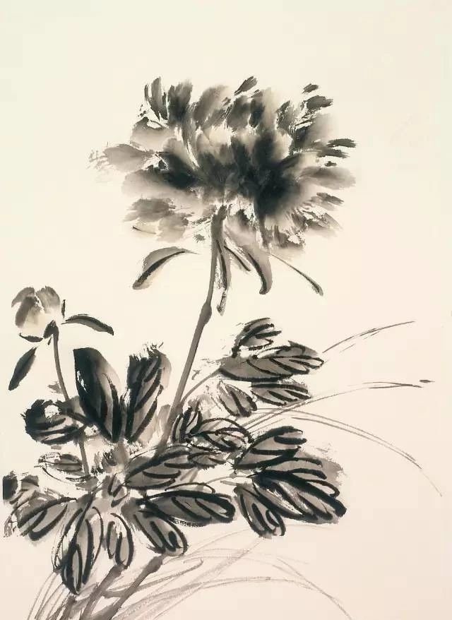 画水墨牡丹要体现古气,通过墨色的变化来体现浓淡和虚实的关系。水墨牡丹用笔更要讲究,要求干净利落。花冠的朝向,花瓣的分布及叶片的整碎结合都要做到笔笔到位,一气呵成。