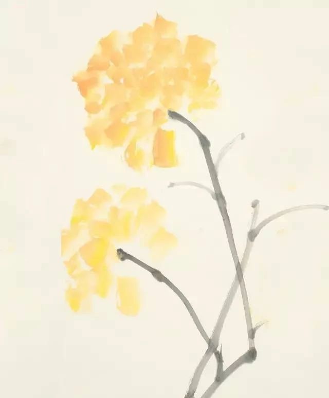 用藤黄加白粉,再蘸赭石画出两朵花冠,注意花冠的朝向。再用墨加少许水分画出枝条。