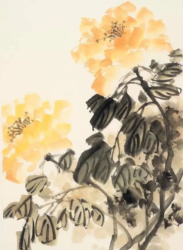 黄牡丹系落叶小灌木或亚灌木,高1—1.5米,茎木质,叶互生,叶片羽状分裂,花瓣9—12瓣,黄色。画黄牡丹可用藤黄加白粉,再蘸花青与赭石着色,叶也可用赭石加花青再蘸墨,以烘托黄花。