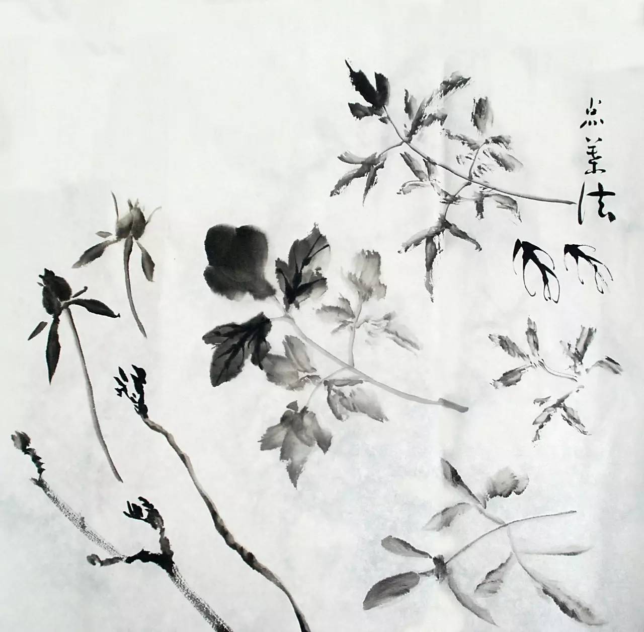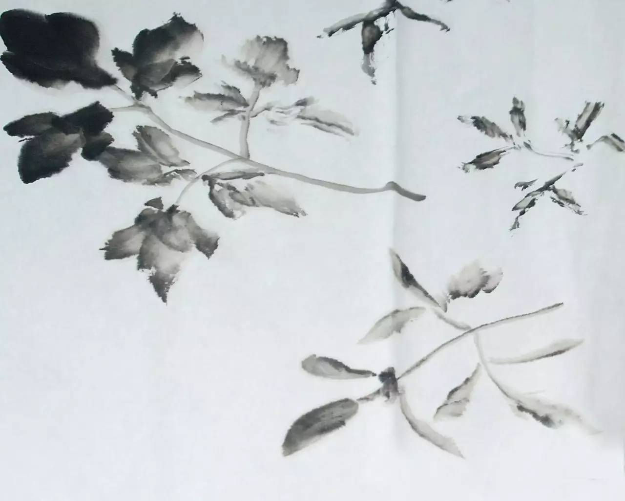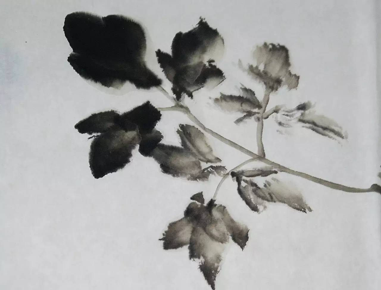 待干未干时用浓墨勾叶茎,区别出不同角度、方向的叶子。