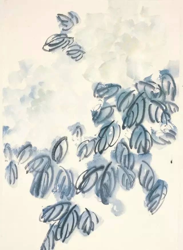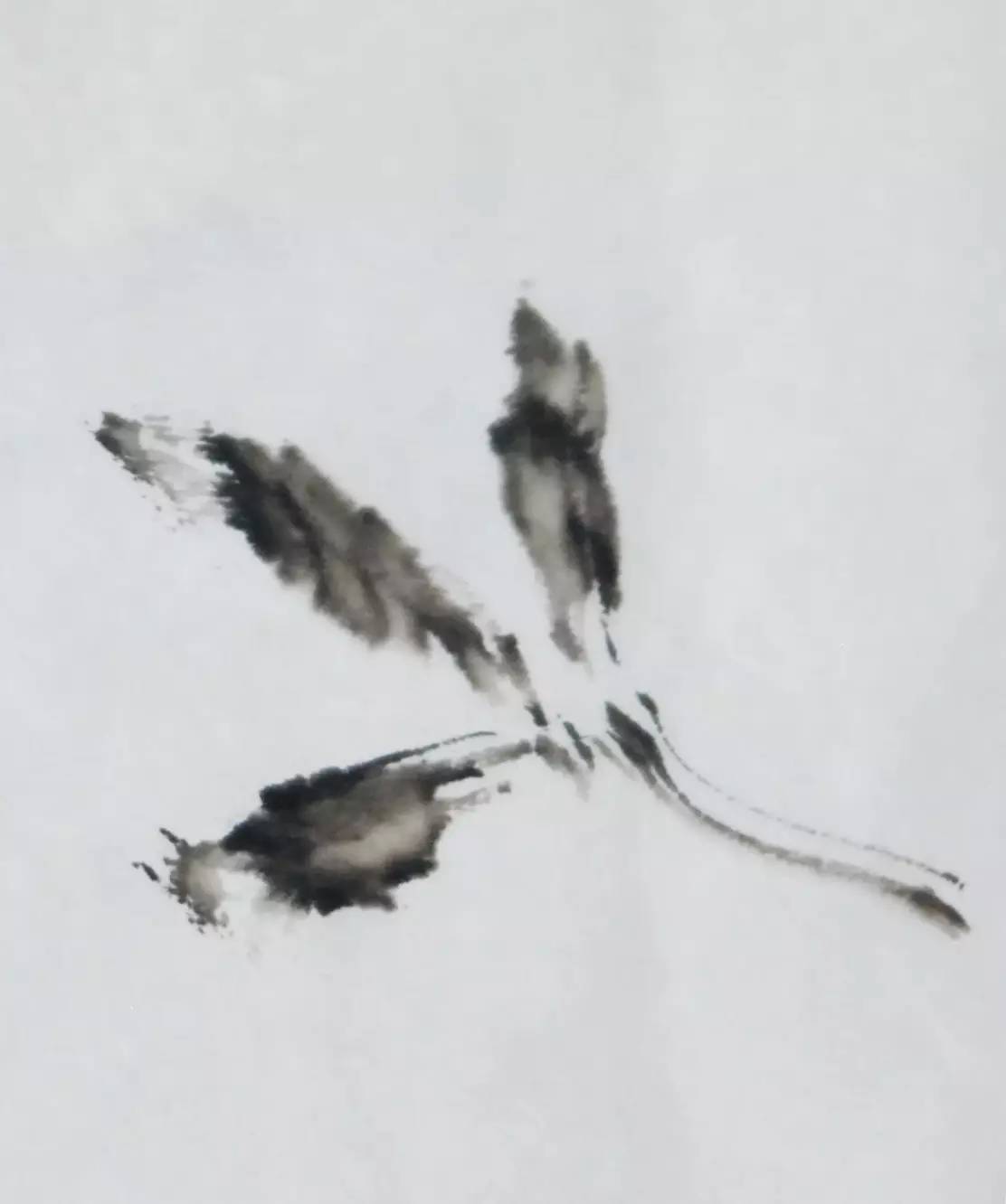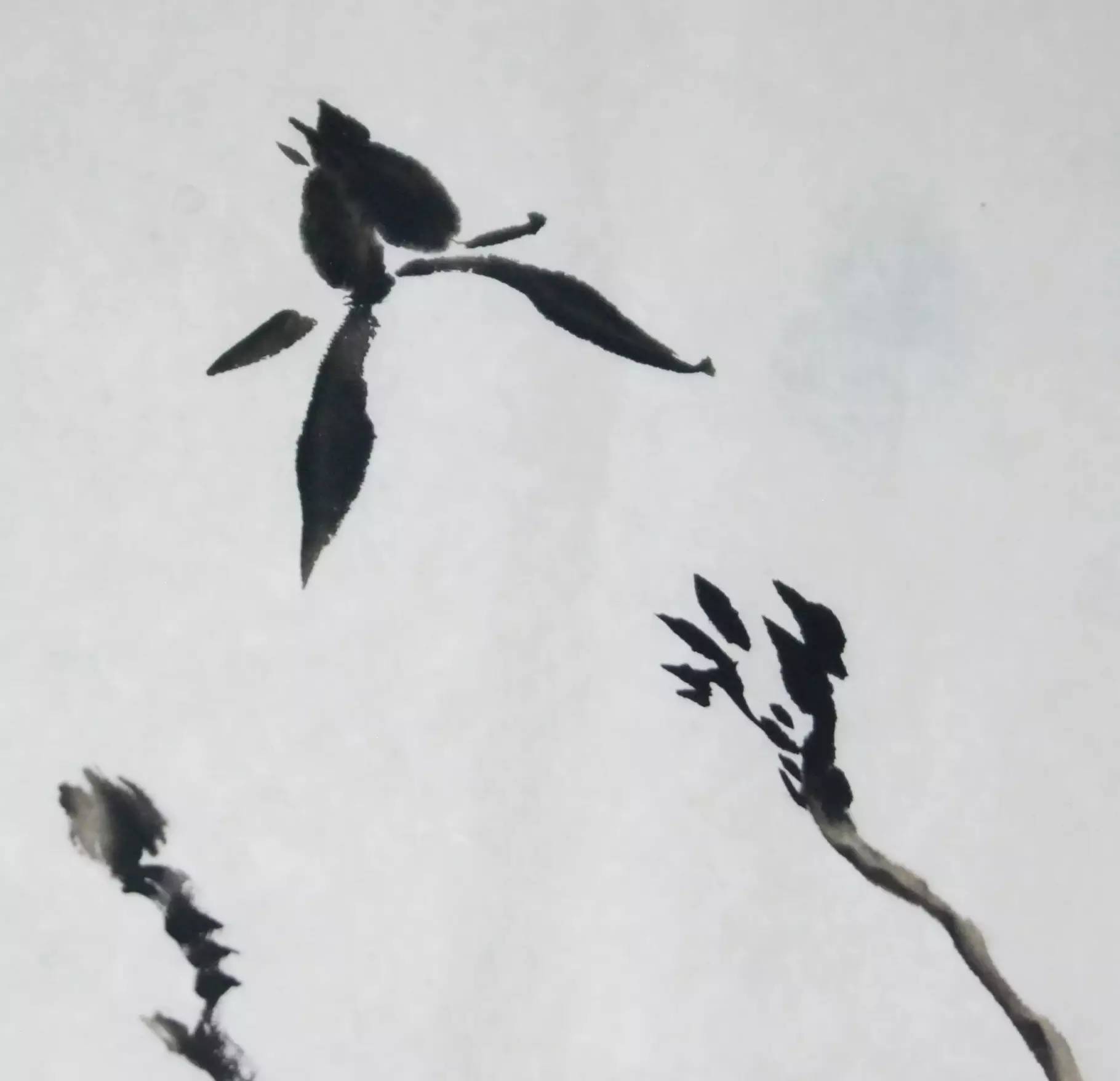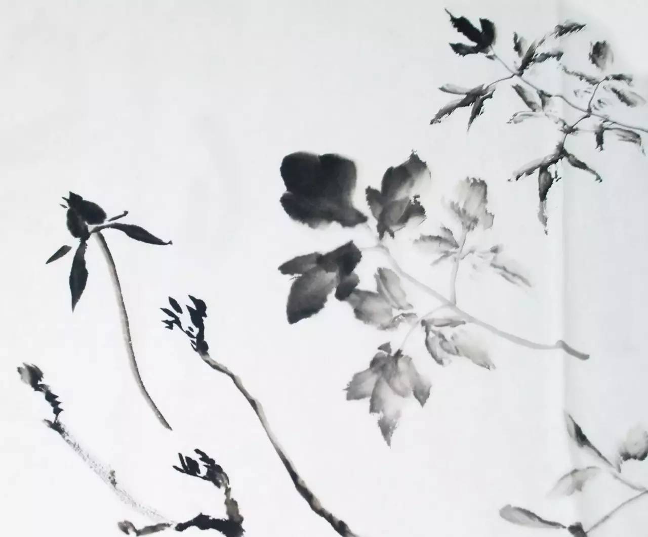 待干未干时用浓墨勾叶茎,区别出不同角度、方向的叶子。