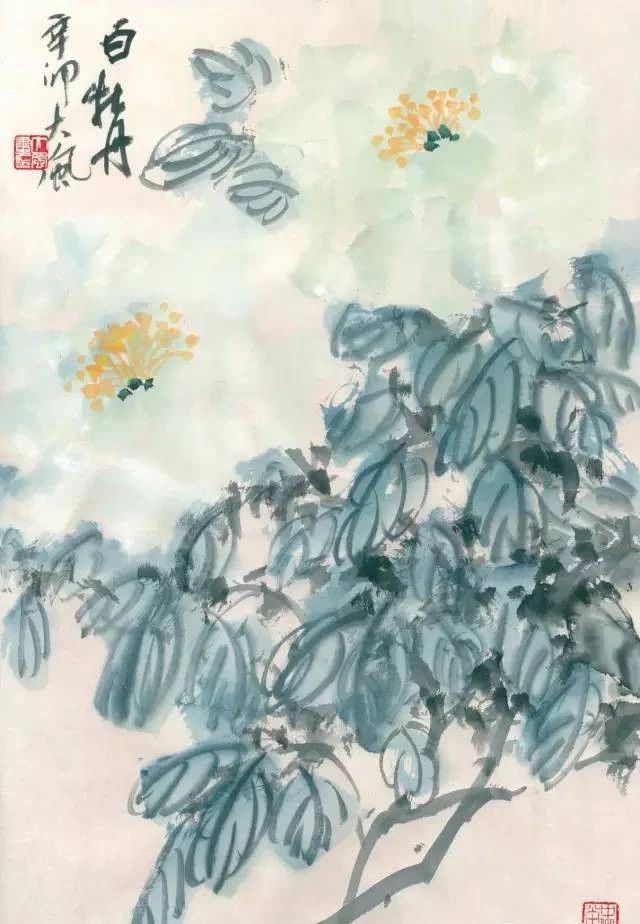 白粉调淡绿加少许淡黄画出两个花冠,注意两朵花的前后虚实关系。用花青加适量水分画叶子,处理好叶子的聚散关系。