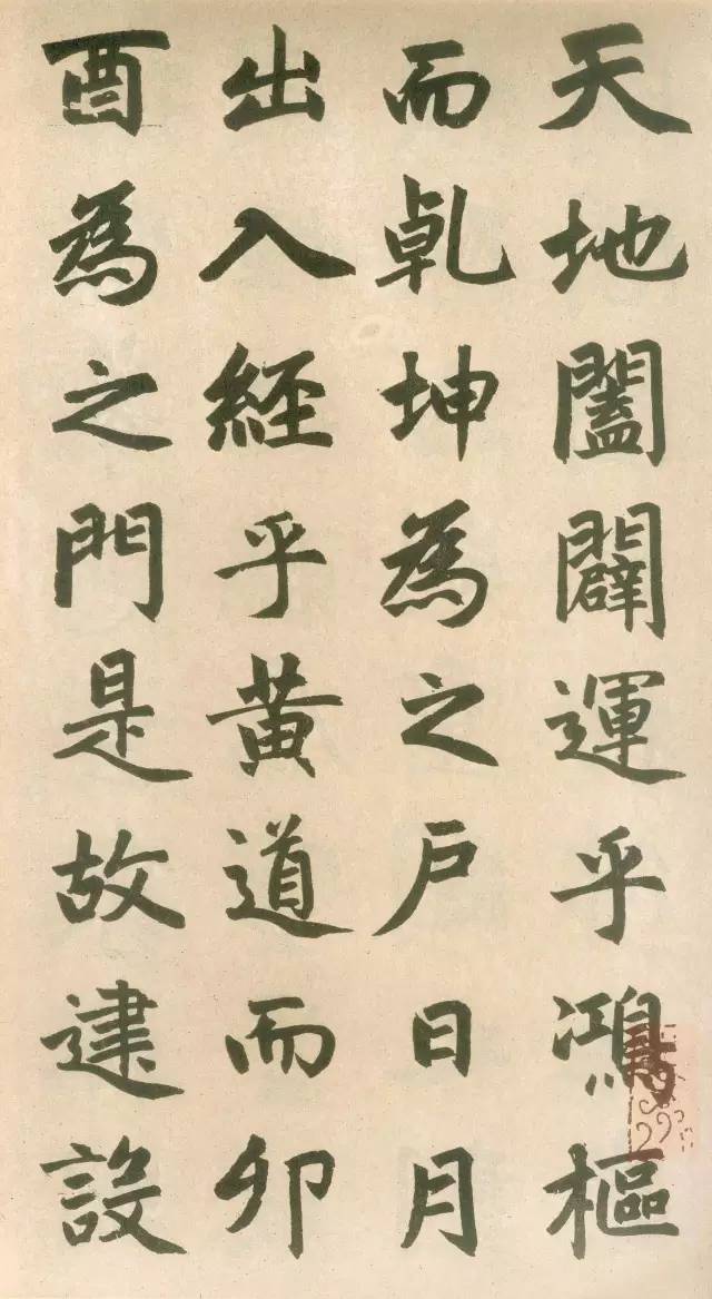 按:学习楷书初级阶段,还是要先从结构平正的一路入手,作为基础。能做到沉着稳健,不至于浮滑无力。孙过庭在《书谱》中讲的学书三个阶段:平正-险绝-平正。后一个平正是一种高超的境界。在追求过结字的险峻奇绝之后,达到一种超逸自然的程度,笔画之间虽起止顿挫分明而气势连贯。这是因为有了行草书“使转纵横”的功力,才不是“算子书”了。