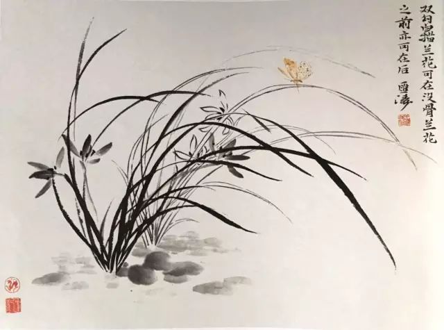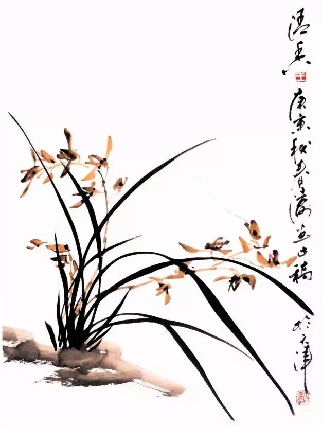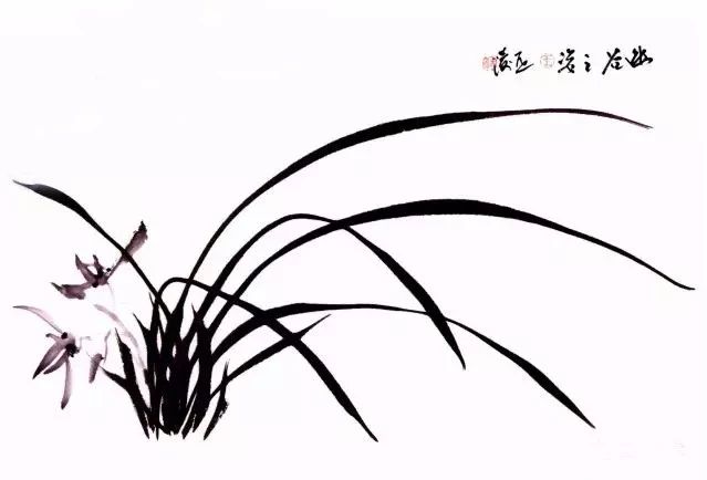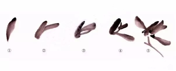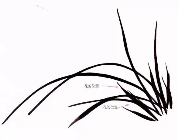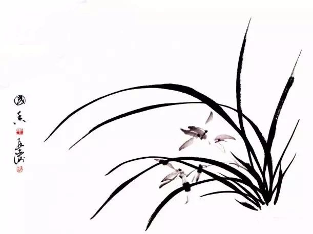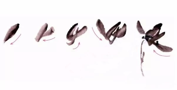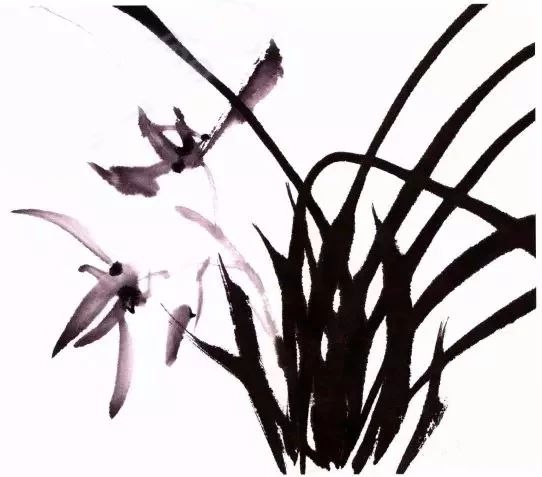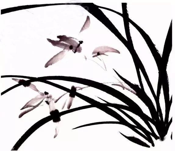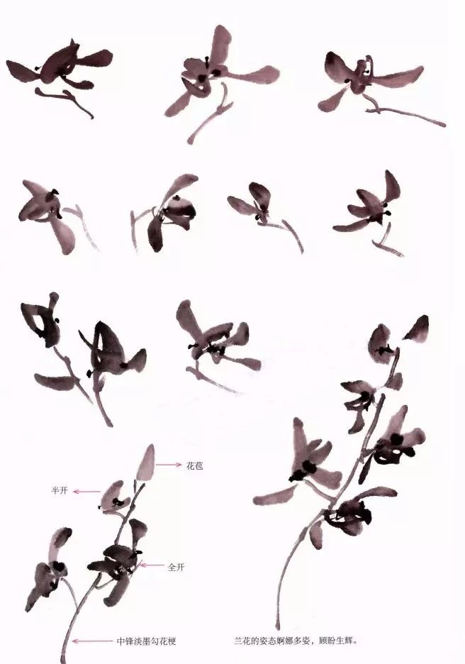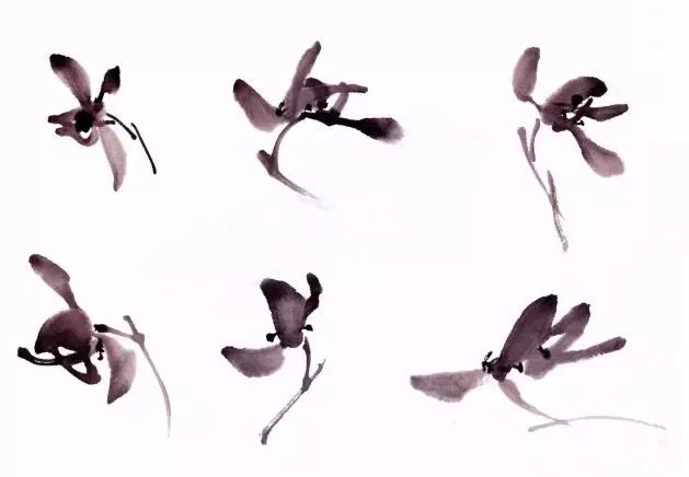 笔尖淡墨果断肯定地向下写出兰花花瓣,尤如写行书、草书般爽快。过慢则渗化不清。花瓣的交叠注意疏密,花头用笔要连贯,勿画一瓣调一次墨。用笔时提按、虚实要有变化,切忌无墨色及无轻重的变化,点花心要等花头墨色快干时着手。用笔要劲利、潇洒,每笔皆要讲究笔法,如同书法一般,勿浮滑尖薄。