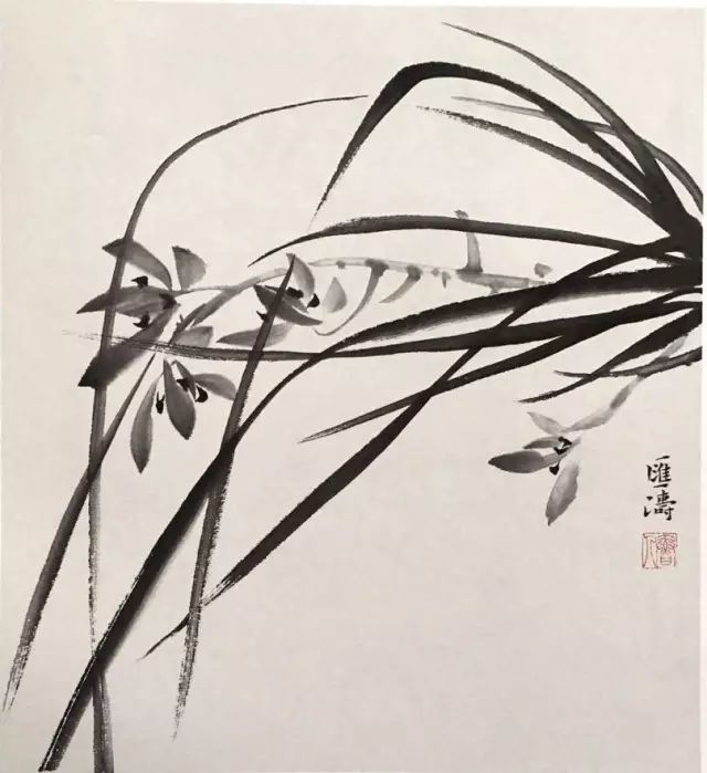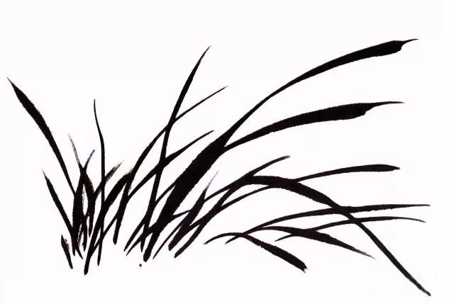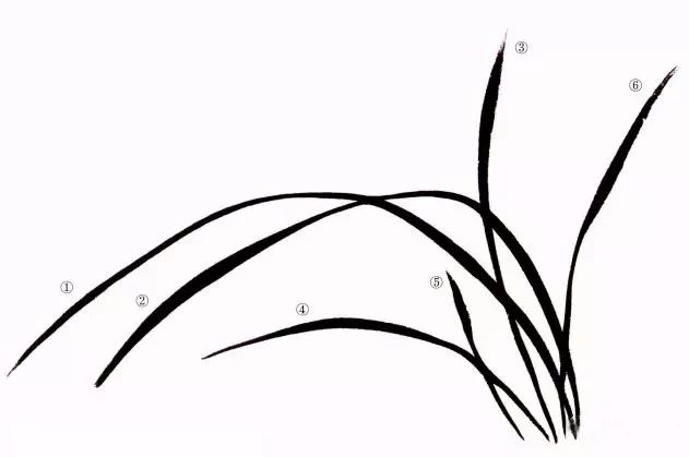 步骤一:用浓墨(略加少许水分)中锋画叶,行笔流畅而不飘浮,用提按圆转的笔法表现兰叶的粗细、方向的变化。↓↓↓