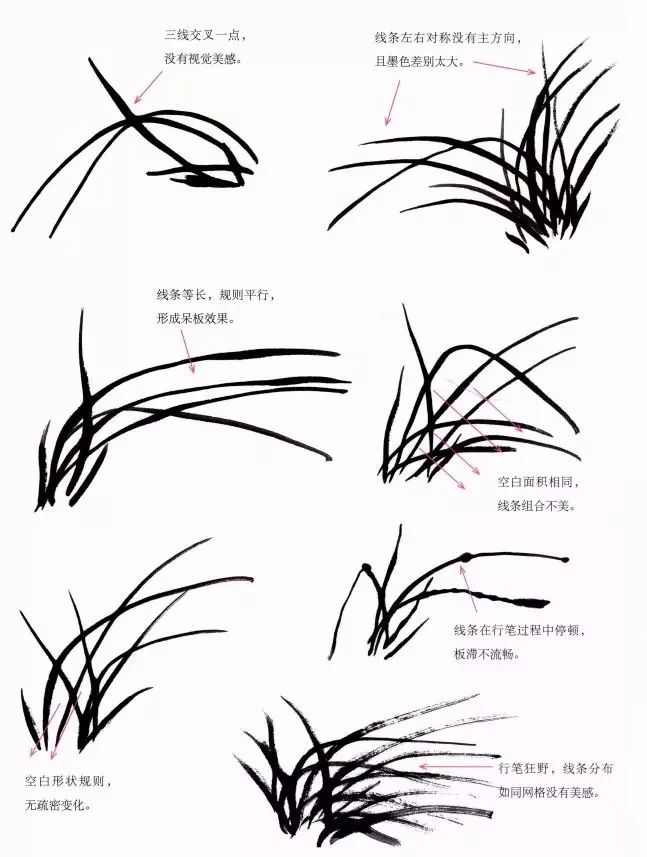 画兰花难就在于此,线条穿插如草书中线条的穿插,极其讲究。切忌多线交于一点形成“十字交叉”、“米字交叉”。也不可多线平行而出。