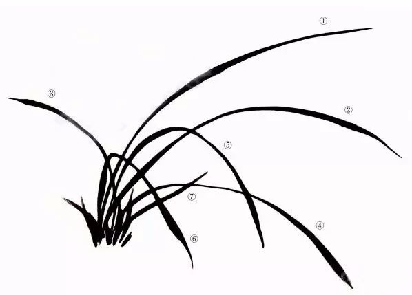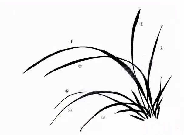 步骤二:加画其他兰叶,注意留出兰花的位置,勾画兰叶时注意线条在长短、疏密、方向、宽窄、空白分割等方面的变化。(①—⑦为用笔顺序,应灵活应用。)↓↓↓