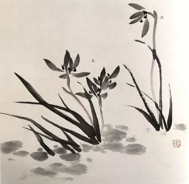 画面之中,布局勿平均对待,整株兰叶、兰花要分清主次关系。在上图中,左边居中的兰花有三朵,兰叶较之右边更多,故此株为主,而右边相望的一株为次。