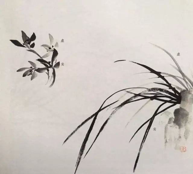 主茎兰花显弧线形向下弯曲,其势伸向了画面的下方,在右下有一花头向上呼应,有若小鸟呼唤林中群伴,姿态生动、含蓄,画面自然回味无穷。大势兰叶向左下边延伸,根部若有树枝小叶同样要与之相呼应。在一幅画中,呼应关系若太过则只能使画面变得程式化、单调,故呼应的处理应以“似是而非”为妙。