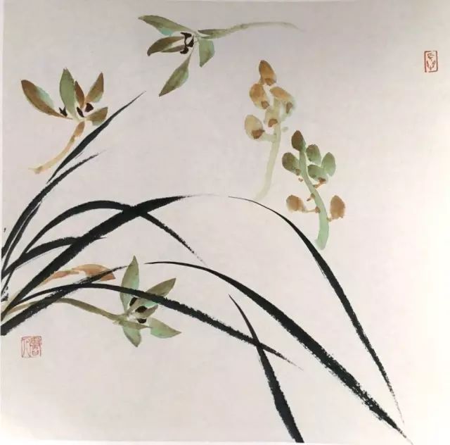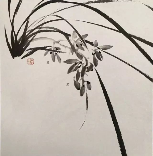 兰花要分前后,即藏露,有花挡叶或叶挡花,方显出层次的微妙变化。藏露皆要含蓄,勿平均处理。意笔兰花虽精概其意,但其生长规律出枝穿叶皆要交待清楚。藏时不可过,过则无法表达兰花为主体的画面传达。画面的空间关系也不可过多,在藏露上多为二到三个层次就可以了,过多的空间前后关系会破坏画面线条的用笔趣味。