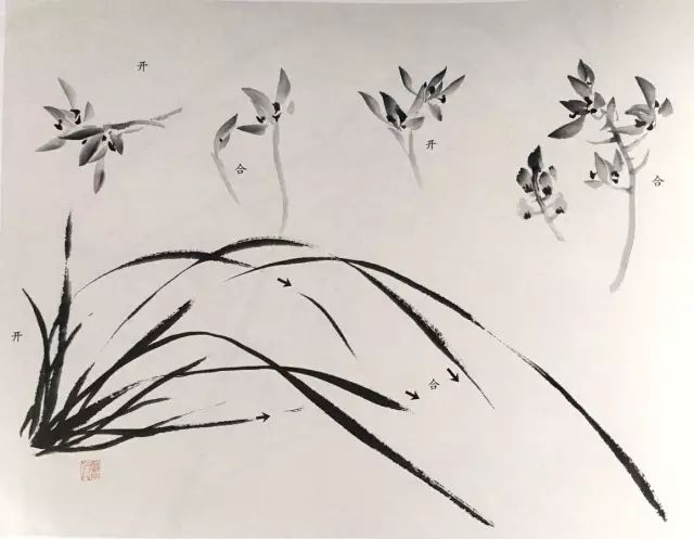 若右边兰叶为合者则勿过分明显,以防机械做作。画兰花时,次要的墨线可以反向出笔增加线条的丰富性。画面之中有了开合关系就多了趣味,若一味地只开不合或只合不开则缺少对比和矛盾,缺少变化。