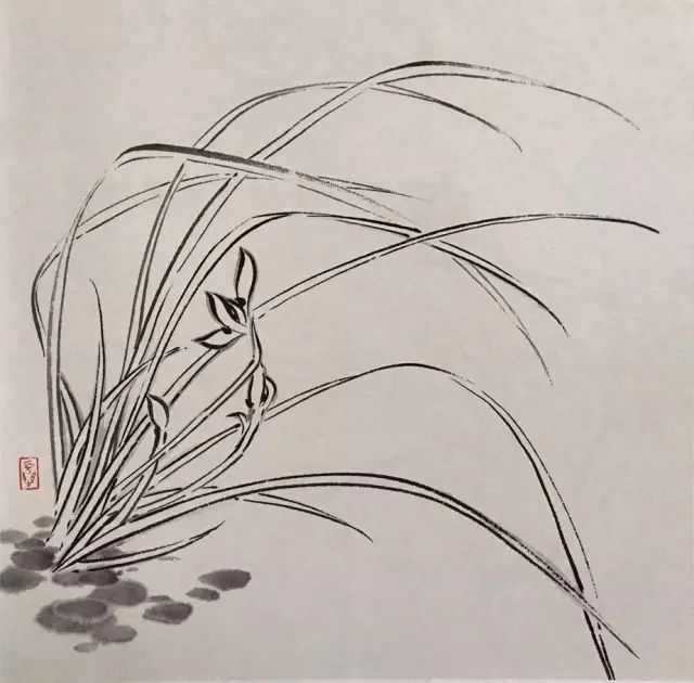 2、用笔勿选过硬的狼毫笔,兼毫或白云为上。水分勿多,多则容易出现墨溢、肥腻现象,也不可太少,少则干枯,无兰花清润之味。墨色一般为淡墨,体现兰花润透、雅逸之特性。