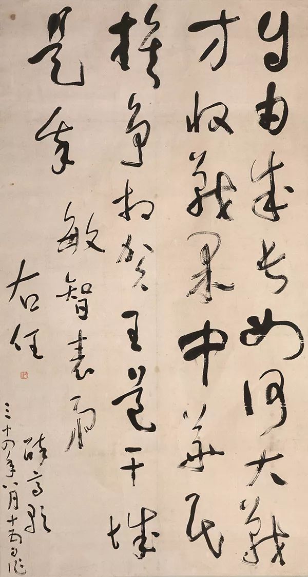 三曰狂草,草书中之美术品也。其为法:重词联,师自然,以诡异鸣高,以博变为能,张颠素狂,振奇千载。《肚痛》、《自叙》,可为代表。一笔草、连绵草,古虽有之,而成系统,开脉流,实自此始。散氛埃于大地,而日:“挥毫落纸如云烟”,亦可异矣。然其组织之巧,用笔之活,于法理变化,多所启发,且如素师晚年合作,矩矆(左旁为矢)慎严,其贡献之大,唐以后作家,远不逮也!