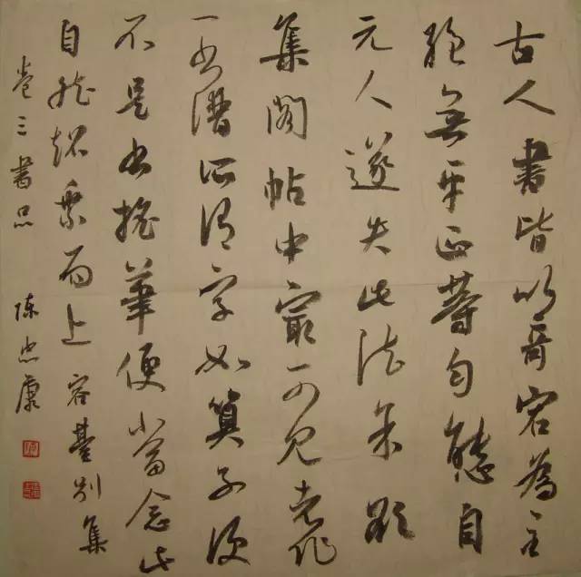 另一方面,我们还要分析自己的症结所在,头痛治头,但如果是由脚气引起的头痛,就应先把脚气治好,对症下药,比如说你们学草书的,应该先学行书,通过行书练技法,使转、提按、收放、笔画之间呼应、上下字的连带关系等等,练好之后,草书就只是个草法问题了。草书严格讲不是学来的,因为从它生成的原始状态看就是一种极度情绪化的东西,由行书提练字形、用笔和手法,是一条正路,这是个方法问题。你现在在临《书谱》,对于《书谱》,你要明白,首先是学他的文章,其次是学他的草法,再次学他的字,在临习时要挑字临而不要统篇抄,严格上说《书谱》只能借鉴而不能学,纵观二十多年来,靠书谱出来的就一个伦杰贤,但伦杰贤先是学得米芾,写米写绝了,因此他是把创作落在《书谱》上而他的功夫却是下在米芾上。写《书谱》写了一辈子的孙墨佛怎么样!你像现在的有些中青年临书谱有成就的,他们都是在借鉴书谱,巧用书谱而不是实写,因此,训练思路要对。