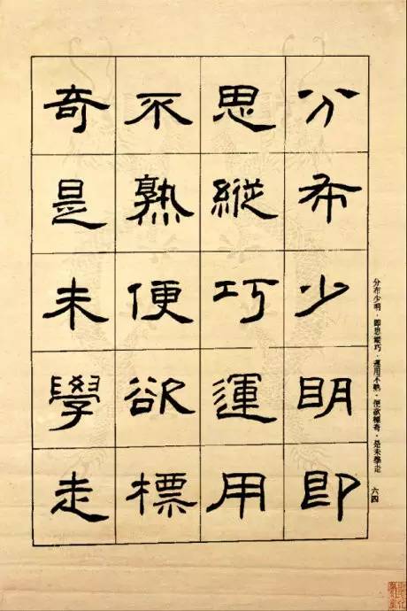 就隶书而言,核心的东西是永远不变的,字再怎么写,关键的部位要控制住,关键部位之外的夸张你不用管他,要靠中间部分来决定中国方块字,任何一个都是这样。凡是夸张的笔画都不是受控制的,不规矩的和不受限制的,古人字形的变化是哪儿来的,实际上是允许夸张的笔画夸张程度的不同引领了风格的不同,同样是在方块中,不同的碑、不同的帖都有一个共同的规律,就是形式美感,其共性部分基本的结构是死的,而只有细微地方的变化,这是一个原则,方块内的不动,而决定字的风格的就是那些可以细微变化的地方夸张的不同,这是一个基本规律。有的字为什么老写不好,就是内在的笔画没有写好,内在的部位可以粗细不一样,大小不一样,但都必须摆匀它,你可以夸大或缩小比例,但必须写匀,要求趣味和变化,必须先有这个理,掌握了这个理再去变化,比如这个“张”字,我们画一个方块,方块内的部位是核心部分,是不变的,把“弓”和“长”的某些笔画在方块内部变一下,增加些趣味,不就变成张迁或是鲜于潢了吗,如果把‘“弓”的第二笔横画和第三笔的弯钩向左夸张一些,再把“长”的横画和捺向右夸张舒展一些,这不就成了礼器或者是曹全了吗,以此类推,其它字也是这个道理。因此,临帖方法要变,观察的方法要变,思路要变,训练的模式也要变。