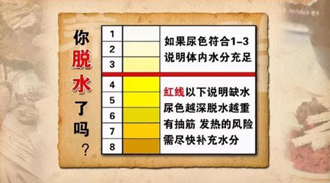 判断身体是否缺水,最简单的就是看尿液颜色。正常的尿液为清澈的淡黄色,尿液颜色越黄,说明缺水越严重。