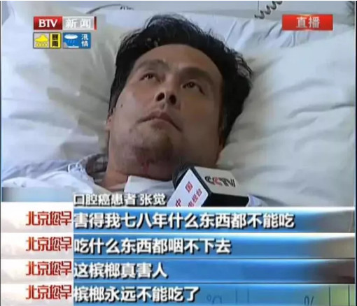 央视报道中提到,槟榔与口腔癌发病有密切关系,湖南中南大学湘雅二医院口腔医疗中心医师张胜解释道:“口腔癌有60%左右的患者都和吃槟榔有关”。