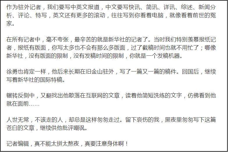 新华社《环球》杂志副总编辑刘洪在其个人微信公众号“牛弹琴”中发文悼念徐勇,并谈到了记者的忙碌与不易。